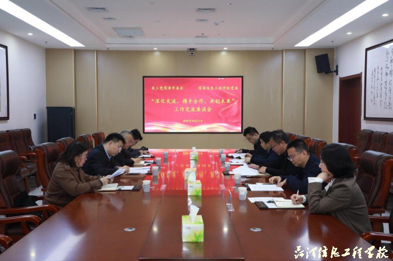 为全面贯彻落实党的二十届四中全会精神,进一步加强民主党派和党外知识分子基层组织建设,10月31日,农工党菏泽市委会与菏泽信息工程学校党委共同开展“深化交流、携手合作、共创未来”工作交流座谈会。校党委委员、副校长王帅主持,农工党菏泽市委会主委、市政协副秘书长田兴学,农工党菏泽市委会秘书长包立强,农工党菏泽市委会机关一级主任科员李美玲,农工党菏泽市委会机关办公室四级主任科员黄振鹏,校党委委员、副校长周琨和学校有关部门负责人参加座谈。