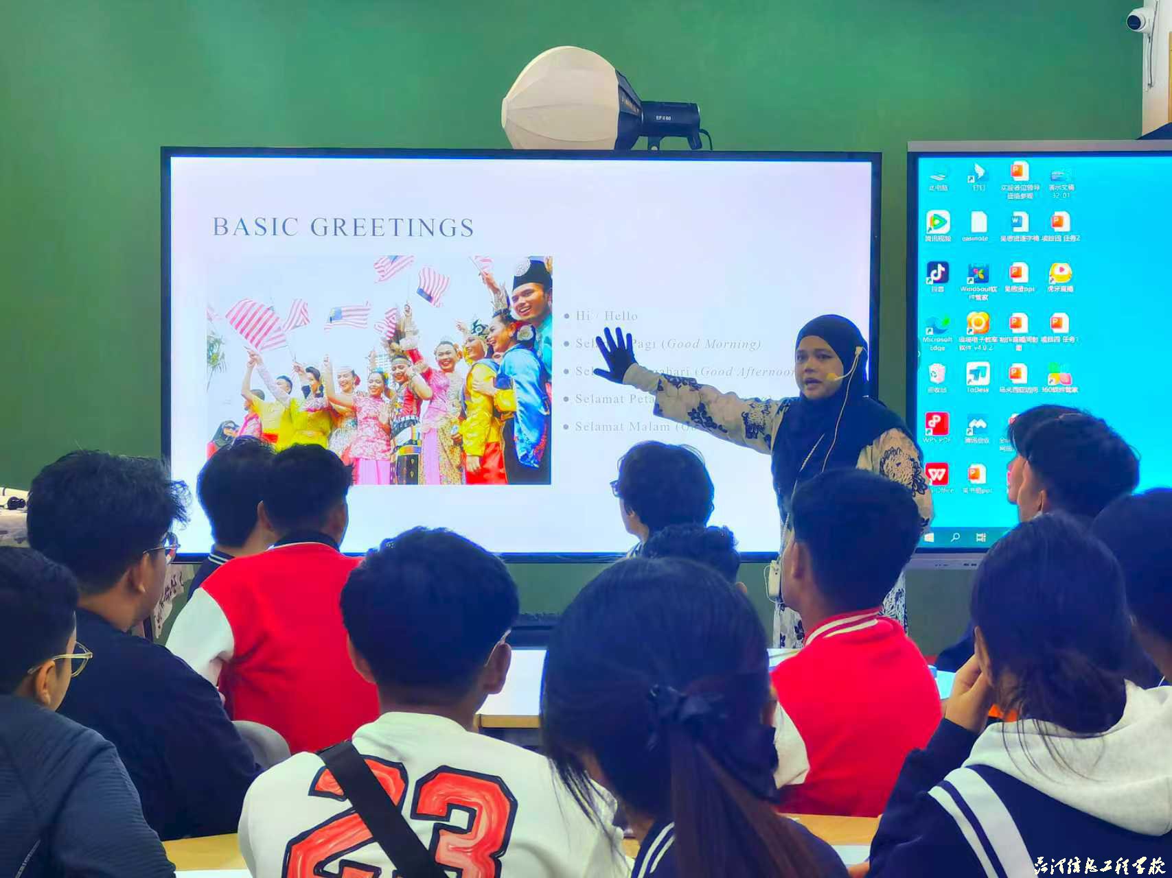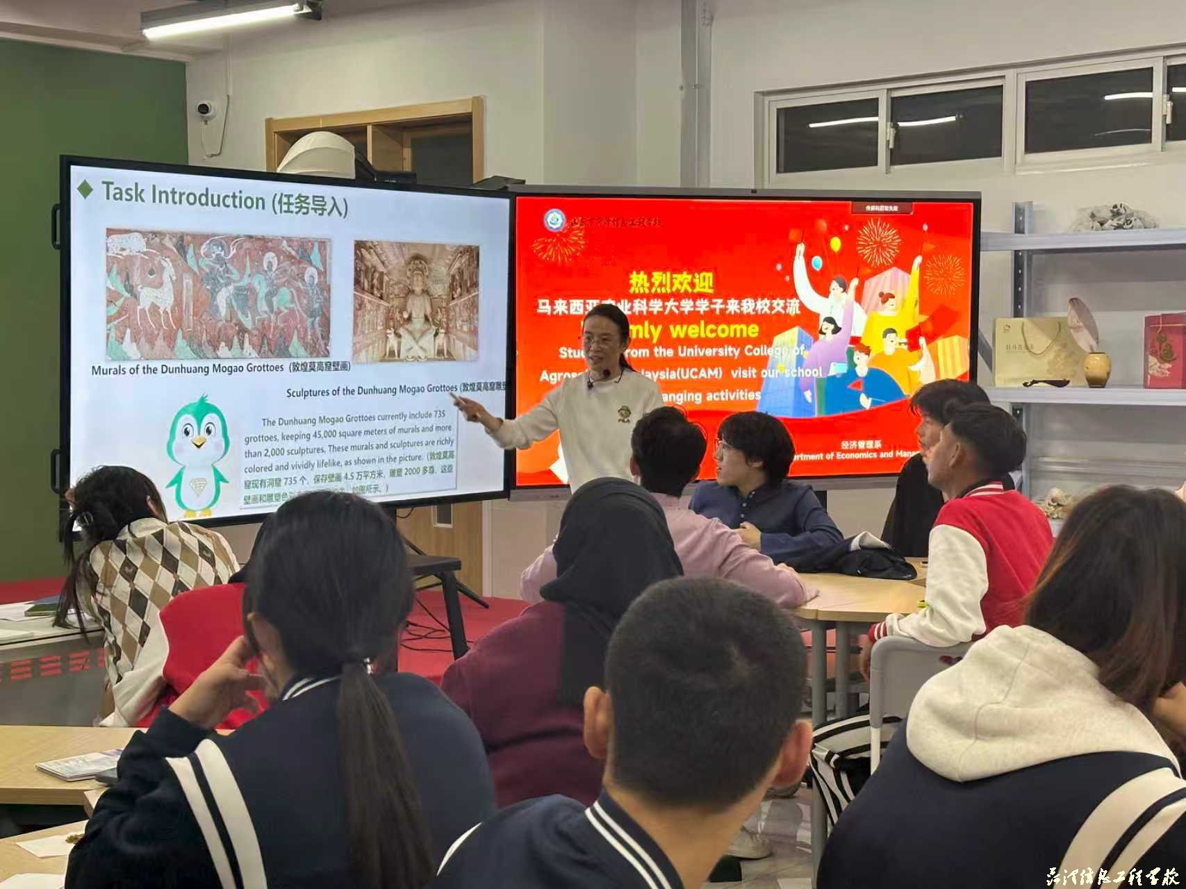 作为交流的重要组成部分,马来西亚随团教师也走进课堂,为我校学子带来了一场生动的马来西亚经贸文化课。他们系统介绍了本国的商贸环境、特色产业与消费市场特点,并邀请学生体验马来传统服饰。这一环节不仅增进了中马青年之间的友谊,更为未来的电商领域合作奠定了文化基础。