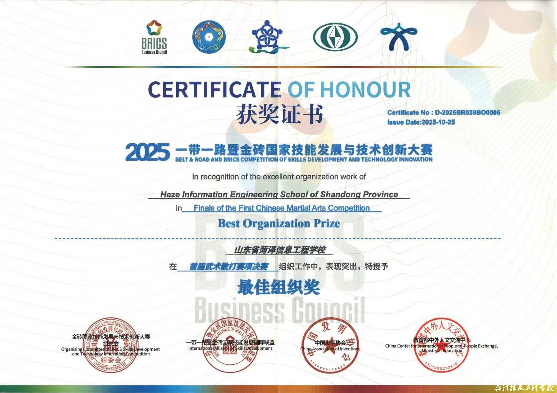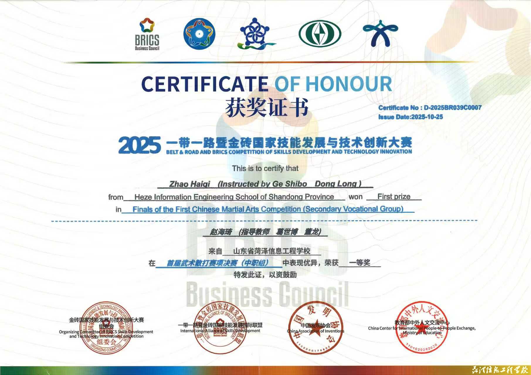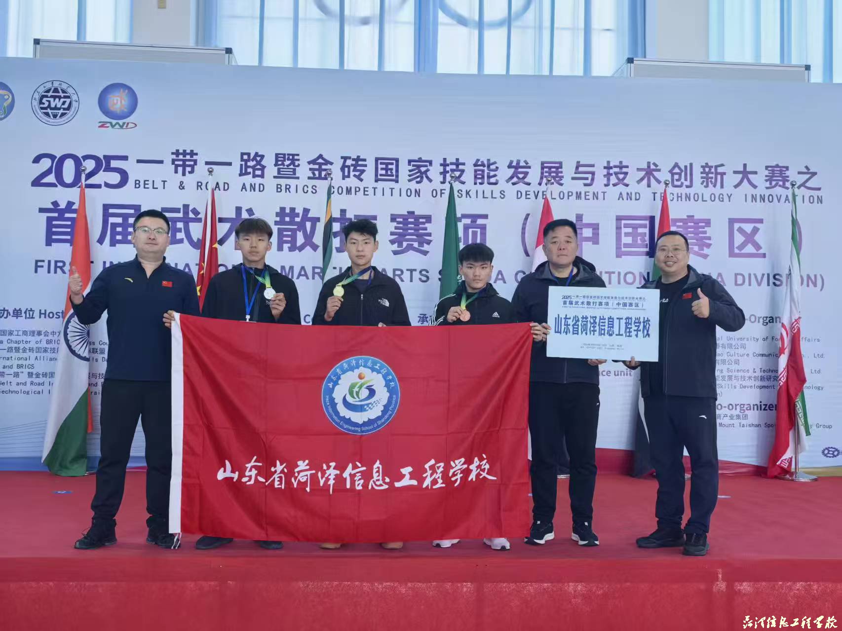 近日,2025一带一路暨金砖国家技能发展与技术创新大赛首届武术散打赛项在山东外事职业大学威海校区圆满落幕,本次赛事吸引全国50余所院校近400名选手参赛。比赛中,我校学子以拼搏与谦逊诠释了“尚武崇德、自强不息”的武术精神,在武术散打项目中斩获多项荣誉,共收获金牌1枚(一等奖)、银牌1枚(二等奖)、铜牌1枚(三等奖)。马魁、葛世博、董龙三位指导老师凭借出色的指导水平荣获“优秀指导教师”称号,学校凭借卓越的组织保障工作荣获“最佳组织奖”。