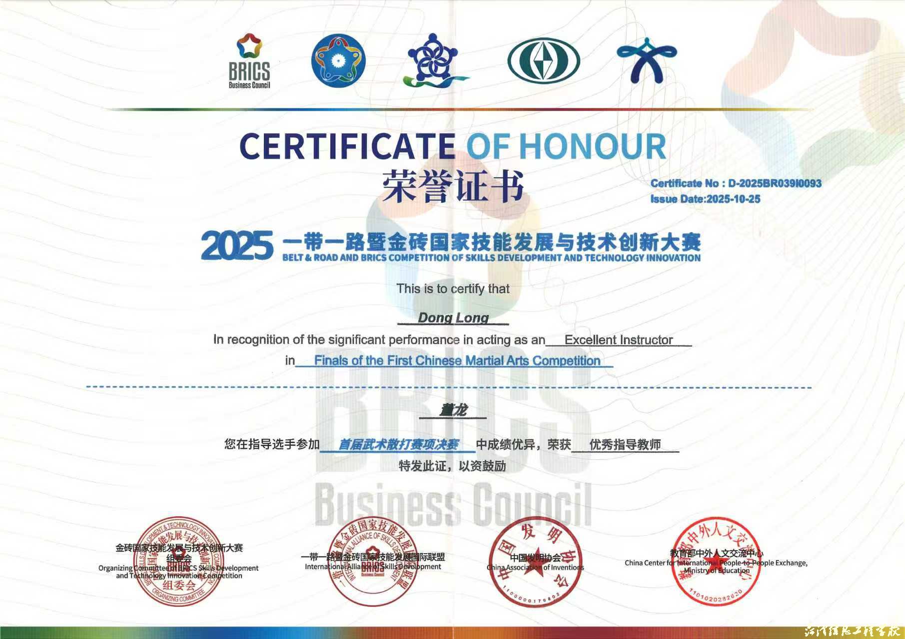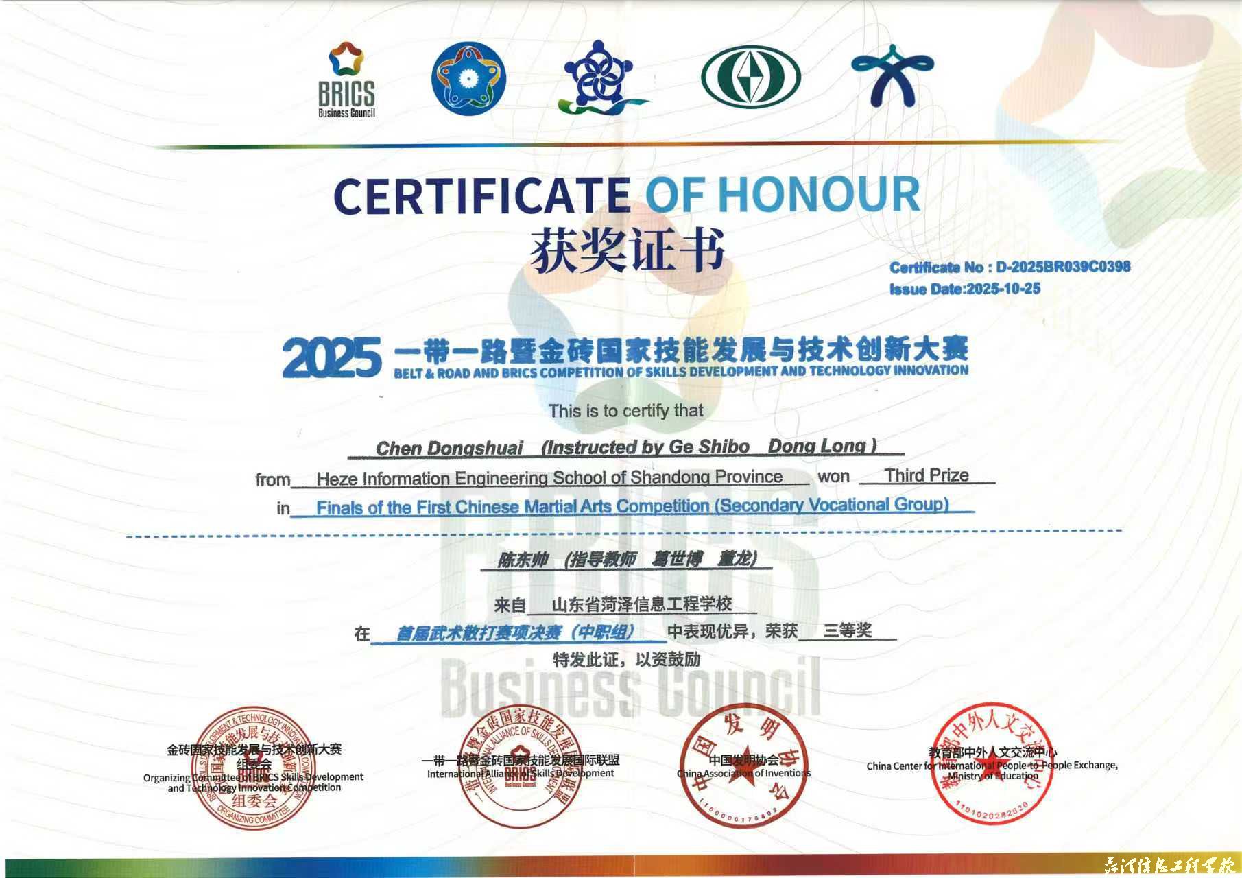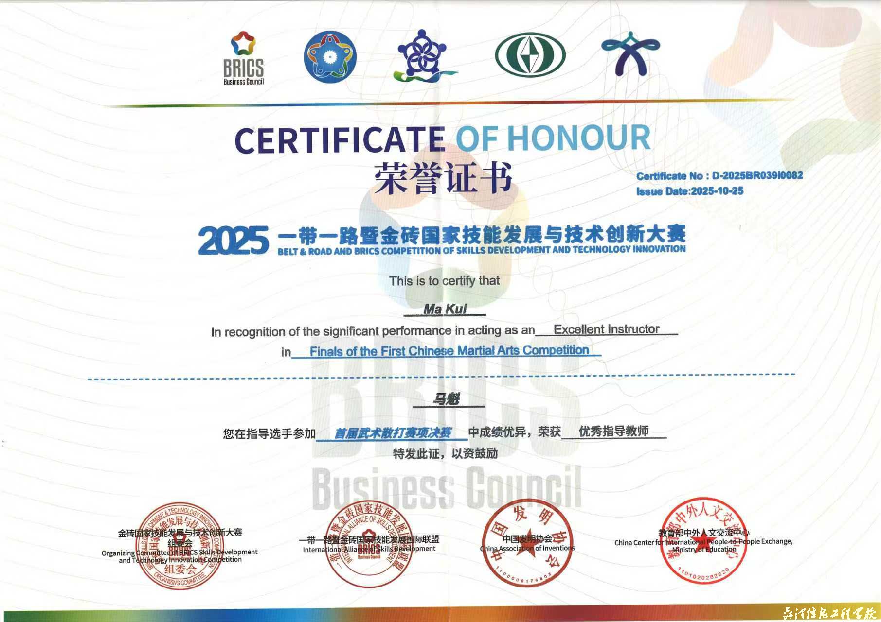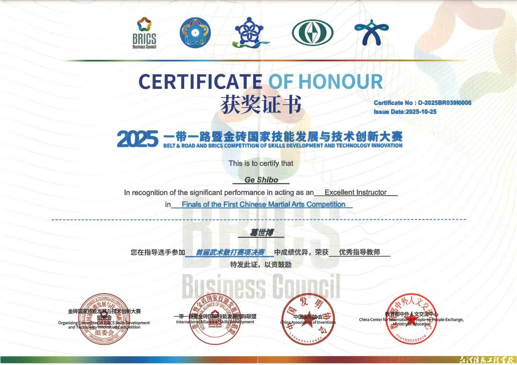 近日,2025一带一路暨金砖国家技能发展与技术创新大赛首届武术散打赛项在山东外事职业大学威海校区圆满落幕,本次赛事吸引全国50余所院校近400名选手参赛。比赛中,我校学子以拼搏与谦逊诠释了“尚武崇德、自强不息”的武术精神,在武术散打项目中斩获多项荣誉,共收获金牌1枚(一等奖)、银牌1枚(二等奖)、铜牌1枚(三等奖)。马魁、葛世博、董龙三位指导老师凭借出色的指导水平荣获“优秀指导教师”称号,学校凭借卓越的组织保障工作荣获“最佳组织奖”。
