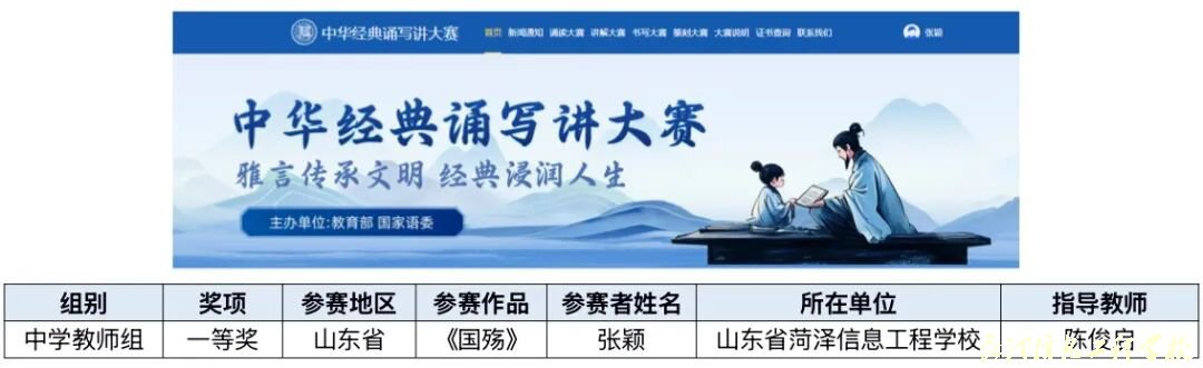 近日,由教育部、国家语委举办的第七届中华经典诵写讲大赛“诗教中国”诗词讲解大赛全国总决赛评选结果揭晓,经过全国初赛、复赛、半决赛、总决赛层层选拔,我校青年教师张颖喜获中学教师组一等奖。