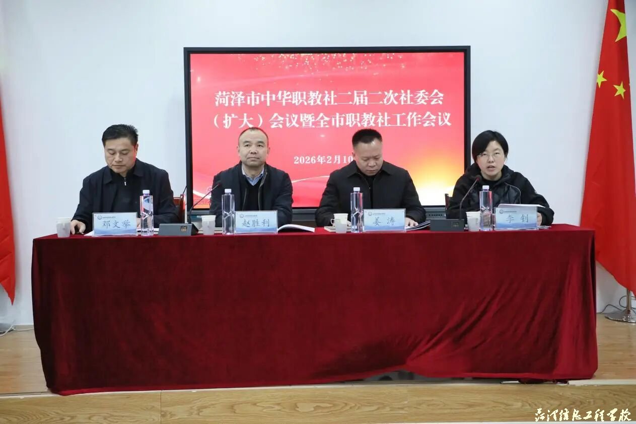 2月10日,菏泽市中华职教社二届二次社委会(扩大)会议暨菏泽市职教社工作会议在我校召开。菏泽市政协副主席、民革市委会主委、市中华职教社主任赵胜利,市委统战部副部长、市社会主义学院副院长、市中华职教社常务副主任姜涛,市教体局党组成员、副局长邓文举出席会议,我校党委副书记、校长校长陈俊启,党委委员、副校长王帅,党委委员、副校长周琨参加会议。市委统战部四级调研员、市中华职教社秘书长李钊主持会议。
